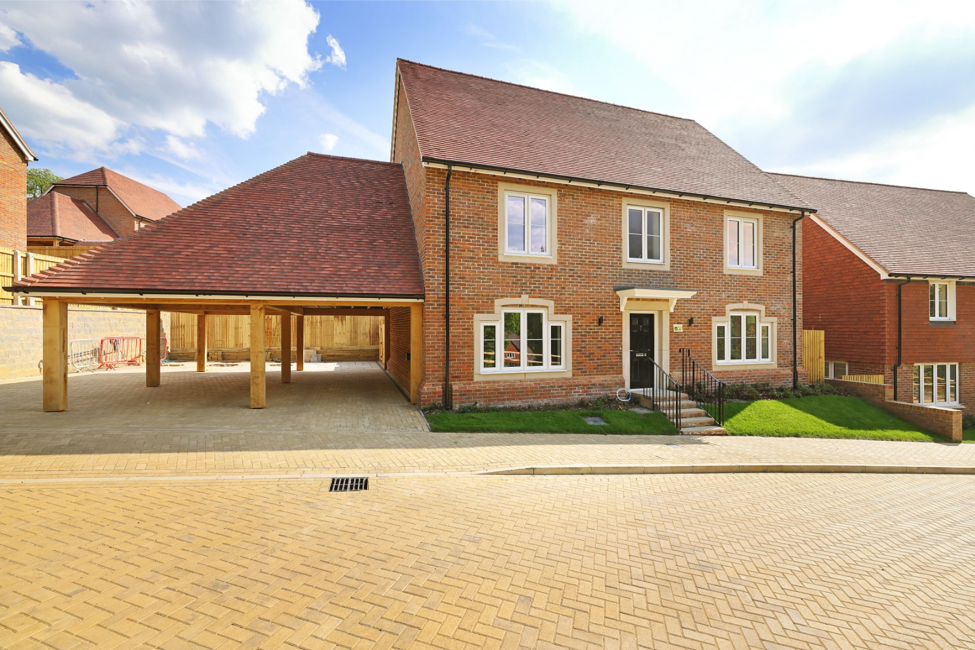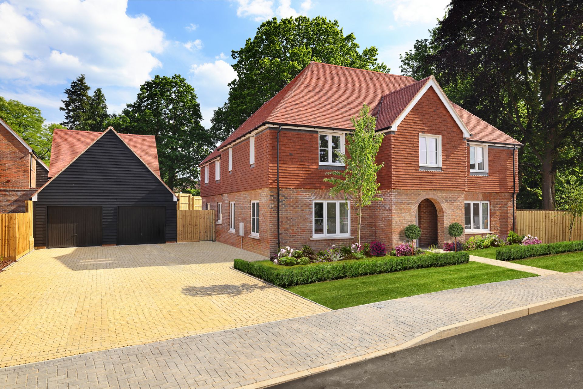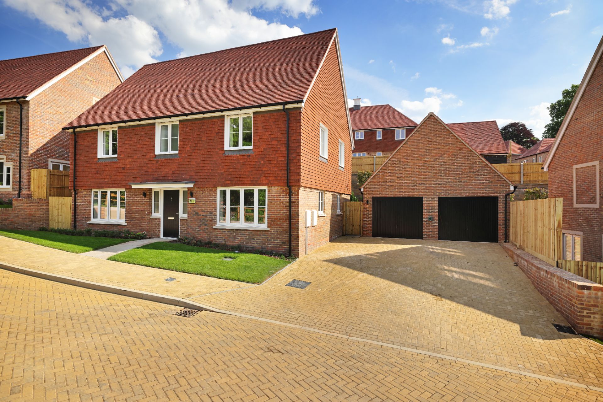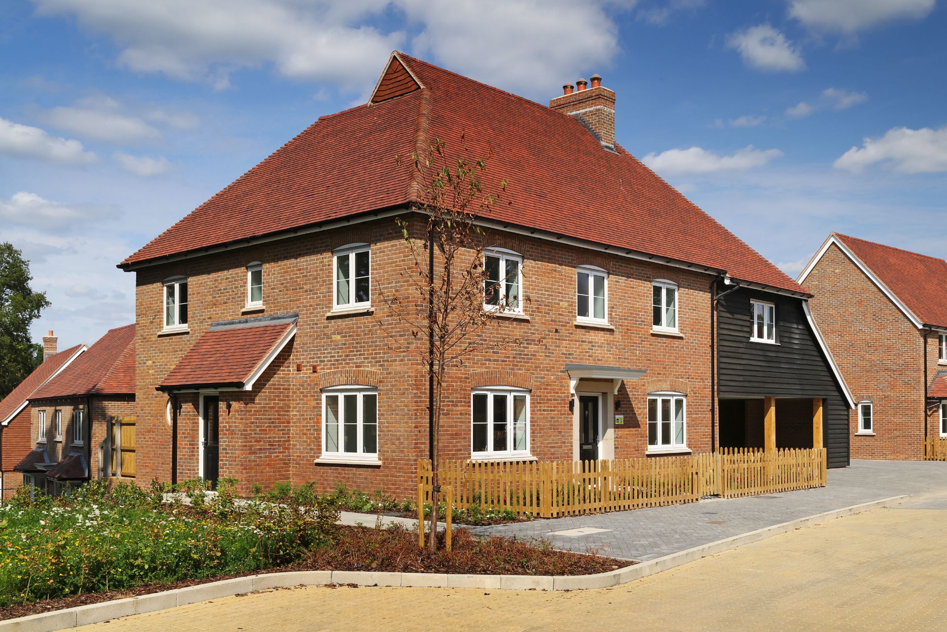 New two-story brick house with a tiled roof, windows with white frames, and a landscaped front garden.